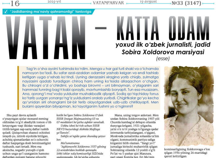 Sobira… Yodimning eng chuqur kavaklarida qad rostlagan birinchi o‘zbek jurnalist ayoli. Yurtimizda xotin-qizlar matbuotining vujudga kelishiga o‘zining ulkan hissasini qo‘shgan Sobira Xoldorova bosib o‘tgan hayot yo‘li, uning achchiq qismati har sahifani varaqlaganim sayin butun chalkashliklari bilan ko‘z o‘ngimdan bir-bir o‘ta boshlaydi. Qatag‘onga uchragan ayolning iztiroblari salqi qovoqlarimga inadi, ko‘zlarimni achitadi, ammo baribir o‘qishdan to‘xtamayman.